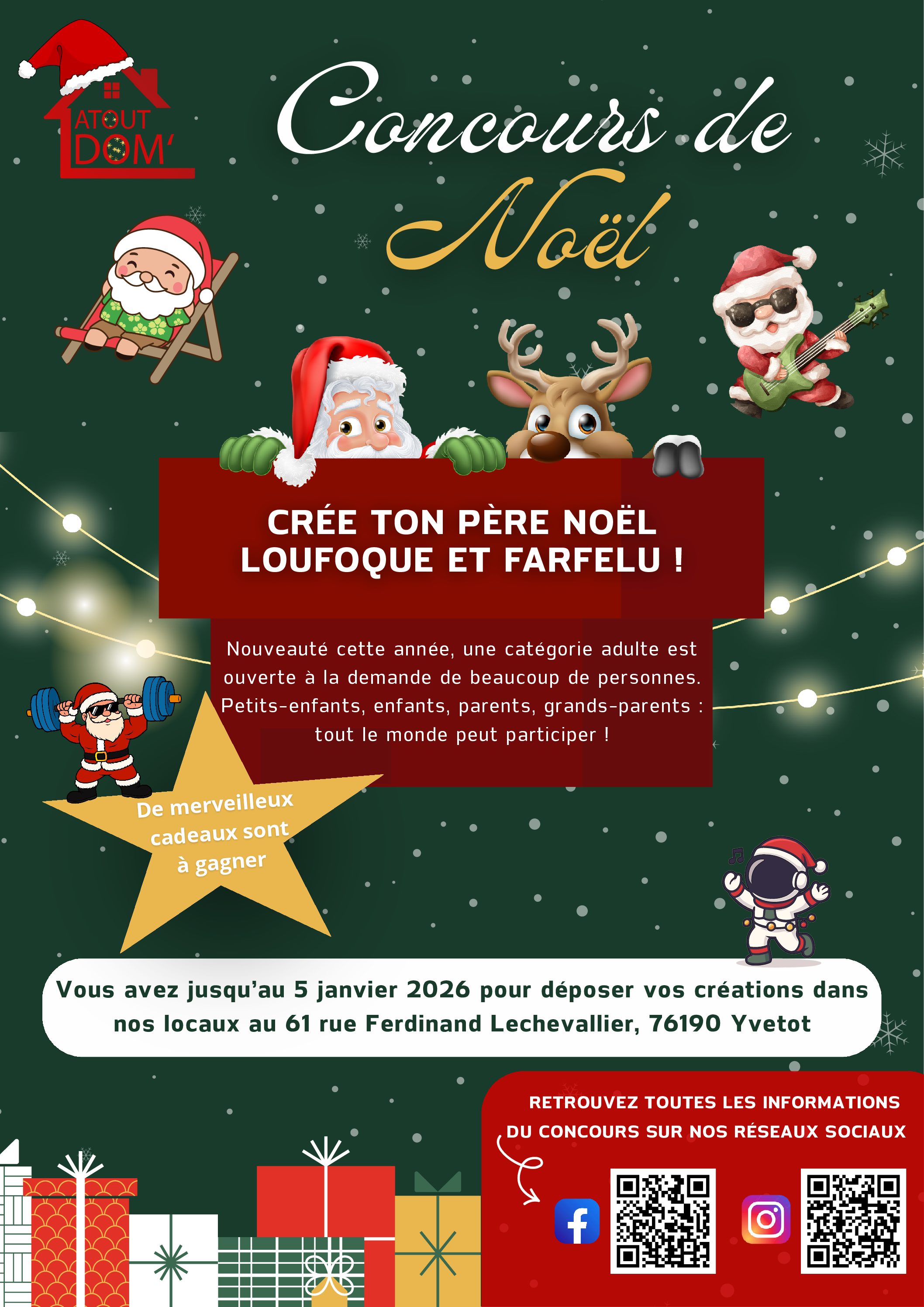 Vous avez jusqu’au 5 janvier 2025 pour déposer vos œuvres au bureau d’Atout Dom et tenter de remporter de jolis cadeaux.